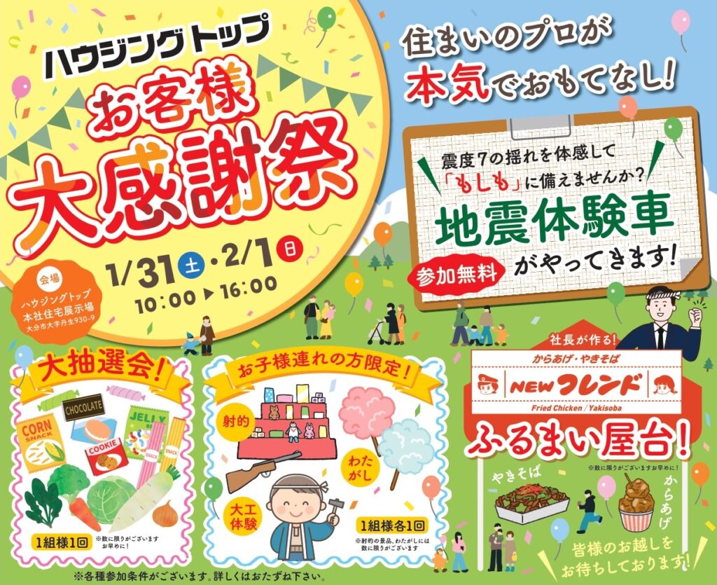 1月31日(土)・2月1日(日)の2日間 ハウジングトップ本社にて大感謝祭を開催いたします😆 地震体験や各種出店、お子様も楽しめる催し物など内容盛りだくさんと なっております。 詳しい情報などは後日お知らせいたしますので […]